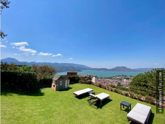 La propiedad con un jardin plano de buen tamaño integrándose a un área social que consta de una terraza techada con sala con chimenea, comedor, alberca y jacuzzi. Esta propiedad, con construcción remodelada acabados en concreto, madera, teja, porcelanatos. Sus desniveles, logran una de las mejores vistas al lago y pueblo de diferentes puntos de la casa.